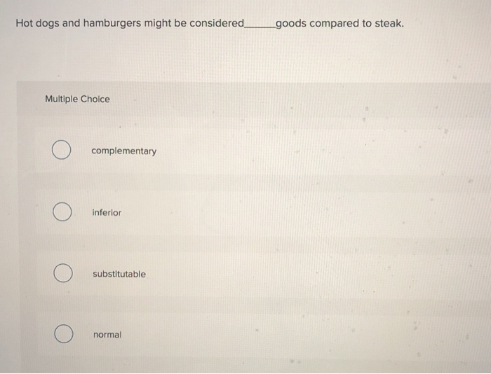10 out of 1000 points Hot dogs and hamburgers might be considered_____goods compared to steak. Hot dogs and hot dog buns are complements.
